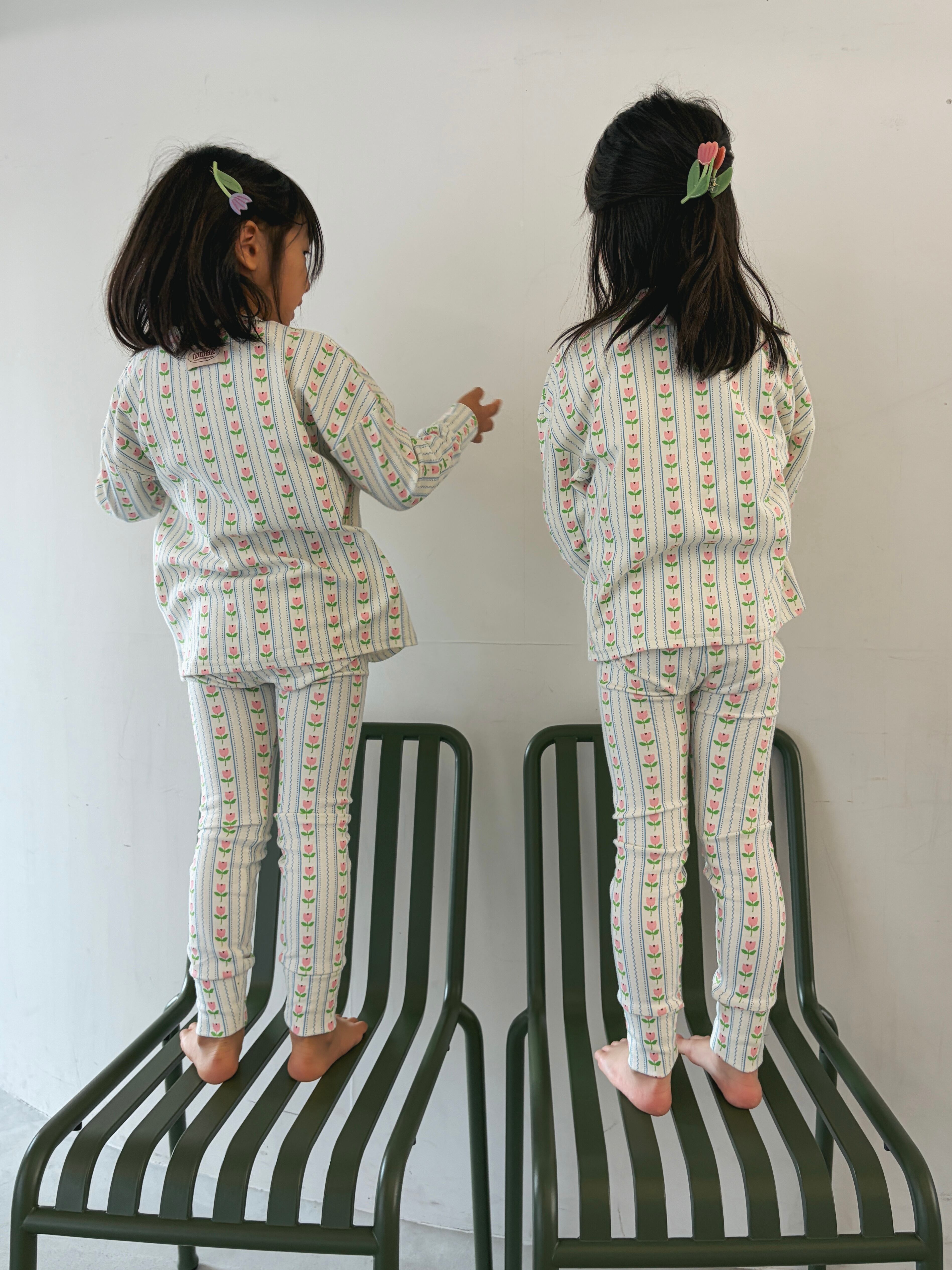 アイボリーをベースに、ピンクのチューリップの縦ラインデザイン。細いライトブルーのストライプが全体を引き締め、甘すぎない爽やかな印象に仕上げています。ナチュラルでどこかレトロな雰囲気を演出します。
