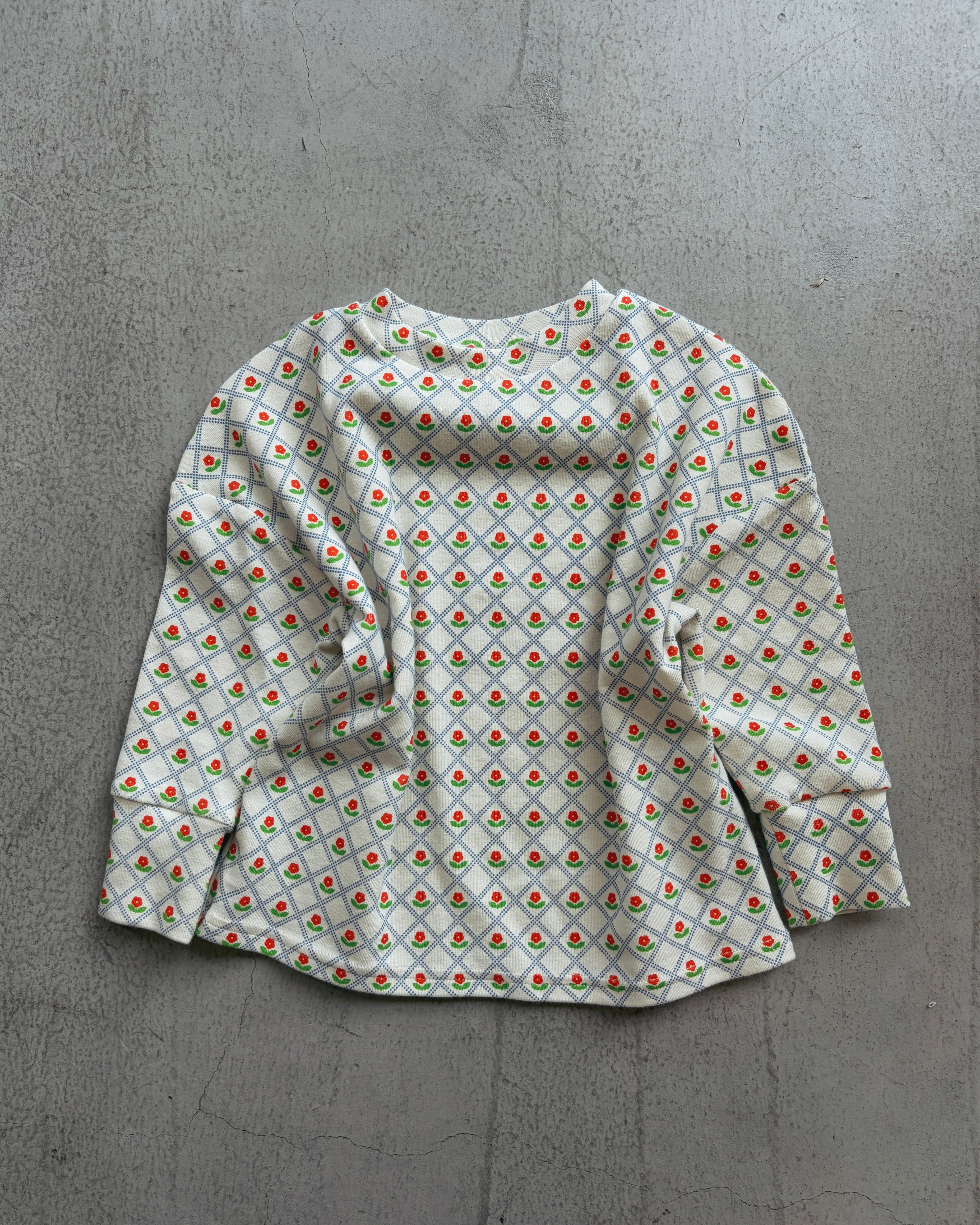 アイボリーベースに、グリーンの格子模様と小花モチーフを規則的に配置したレトロ感のあるデザイン。細かい総柄ながらも統一感があり、1枚でコーディネートの主役になるアイテムです。