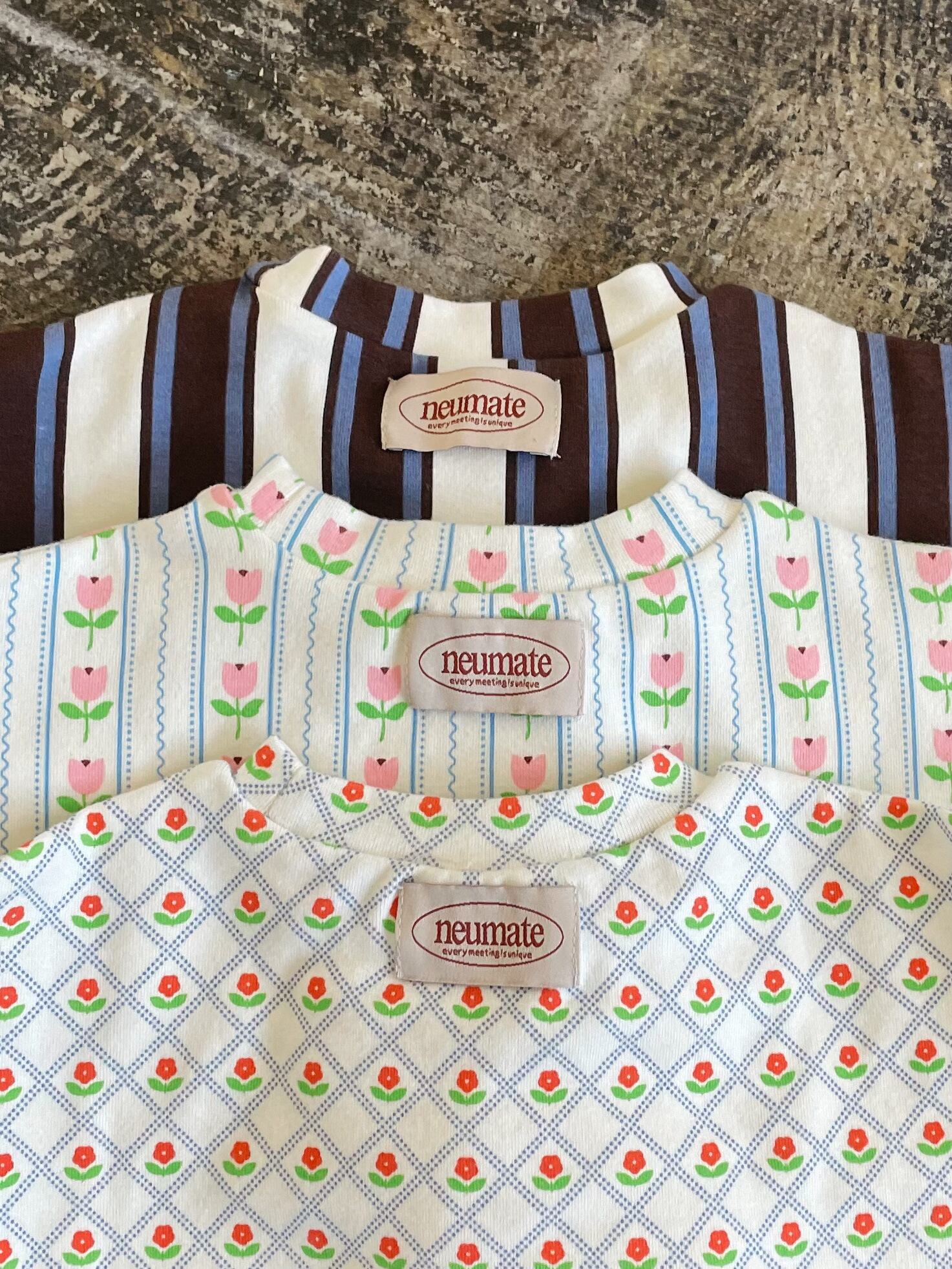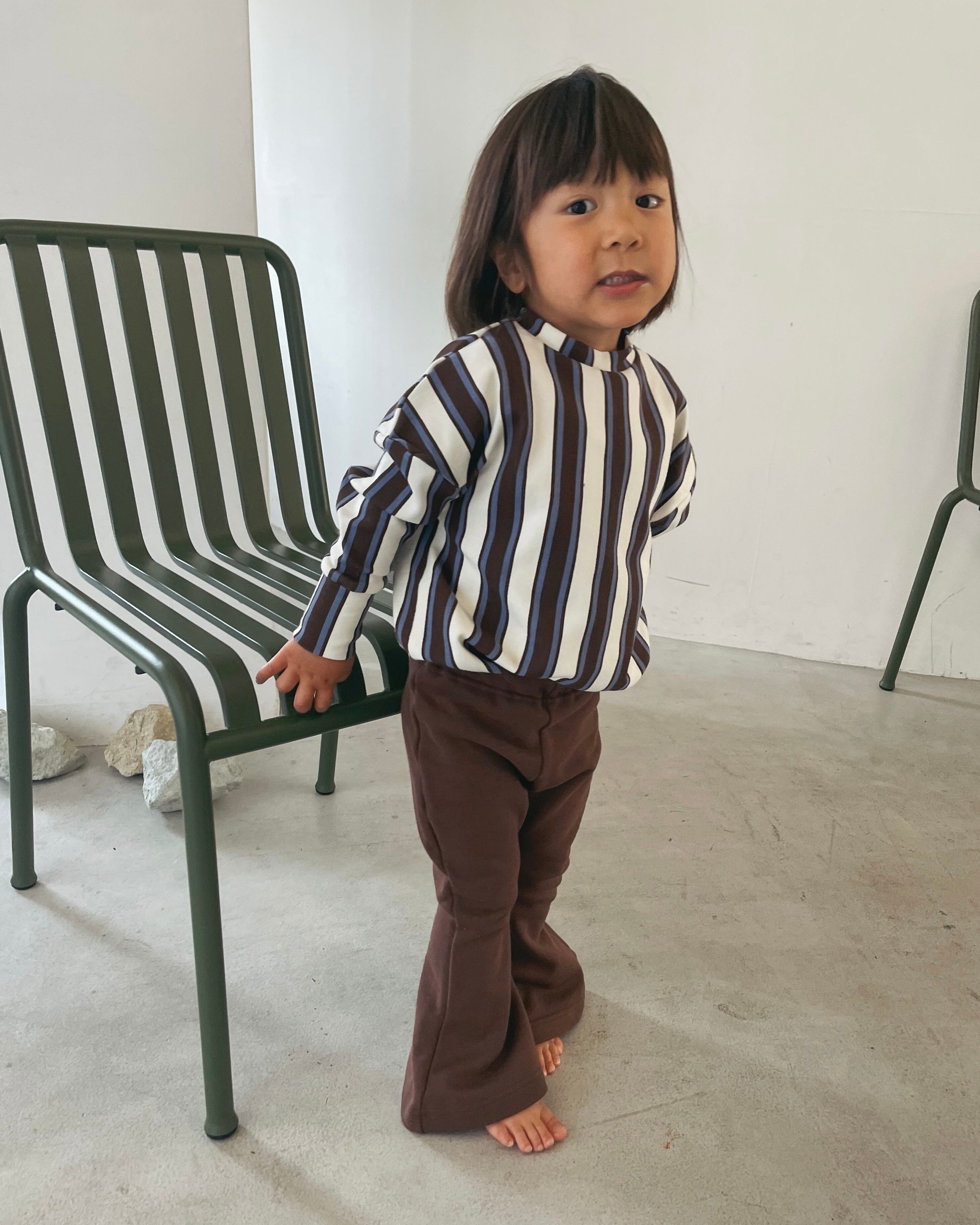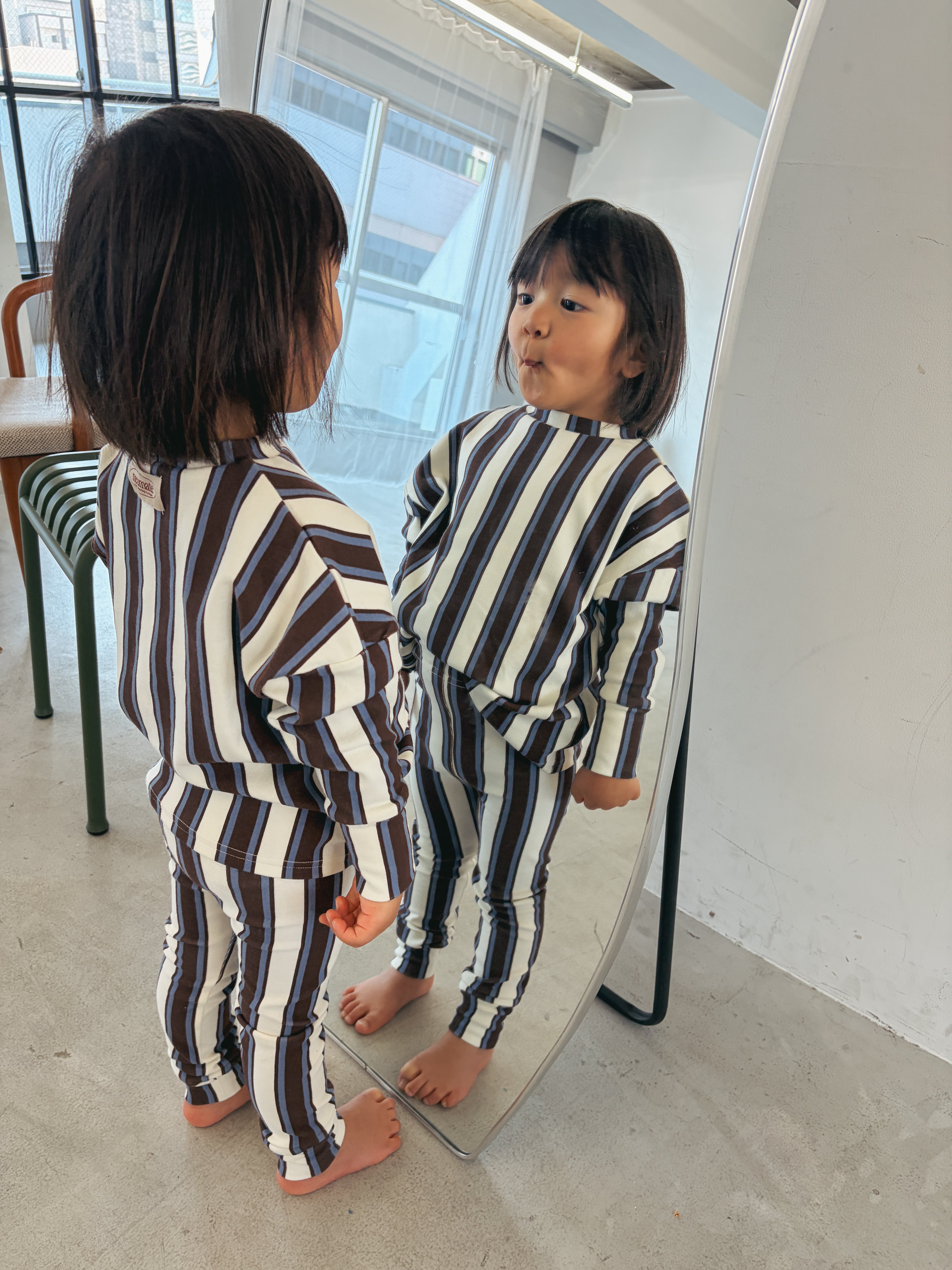 アイボリーベースに、ブラウンとくすみブルーのストライプが規則的に並んだデザイン。カジュアルながらも大人っぽい印象で着用いただけます。